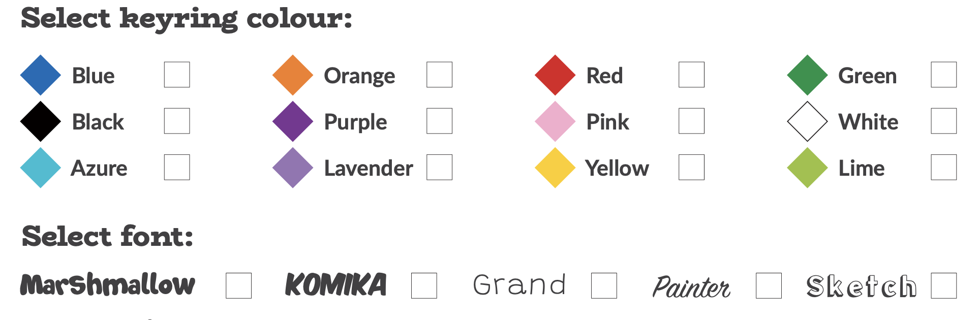 Order in three easy steps: 1. Pick your colour 2. Pick your font 3. Write the text you would like then Fab Bricks Will send your personalised keyring to school in time for Christmas.